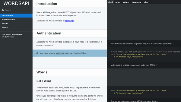 - WordsAPI - An API for the English Language. Find definitions, related words, and more